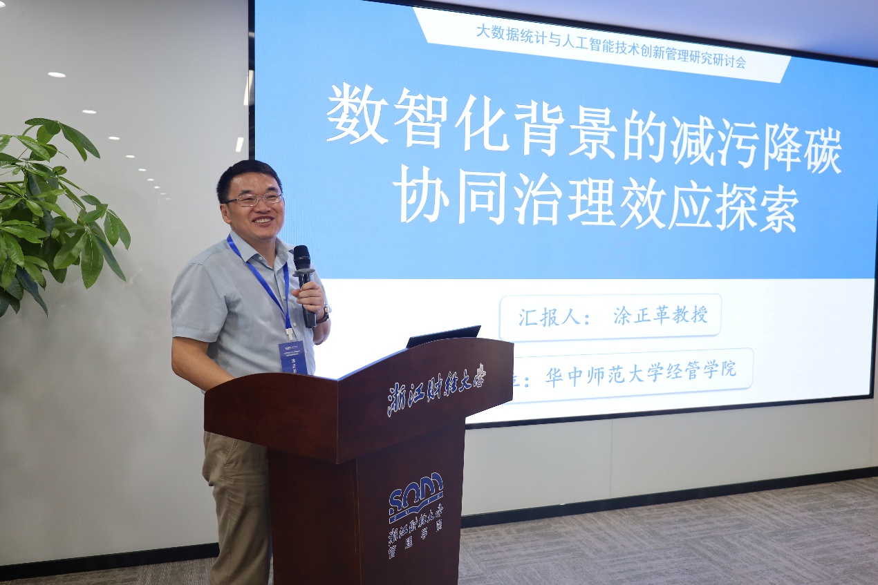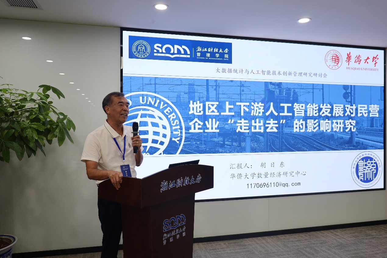 下午下半场由浙江财经大学管理学院副院长张雷教授主持,华中师范大学经济与管理学院院长涂正革教授、华侨大学胡日东教授两位专家特邀报告。涂正革教授分享了“大数据赋能减污降碳协同治理:理论逻辑、实践路径与案例验证”。他指出面对污染源复杂多样、分散难控的挑战,数智化治理上在政策监测排放上已经取得较好成效,未来必须探索更多应用的治理场景,尤其是对数智化绿色生产的赋能,带动源头生产中的减污降碳协同效应。胡日东教授围绕“地区上下游人工智能发展对民营企业‘走出去’的影响研究”进行报告。他提出“地区上下游人工智能发展是否影响以及如何影响民营企业‘走出去’?存在怎样的差异化效应和演变规律?”等议题。他的研究发现下游AI发展显著促进民营企业“走出去”,而上游AI发展的影响相对较弱,证实了AI产业发展存在明显的方向性差异,提出适度加大对下游AI应用生态的资源倾斜,设立"数字贸易服务基金",建设国际化AI应用场景库,同时预留上下游协同创新的发展空间。