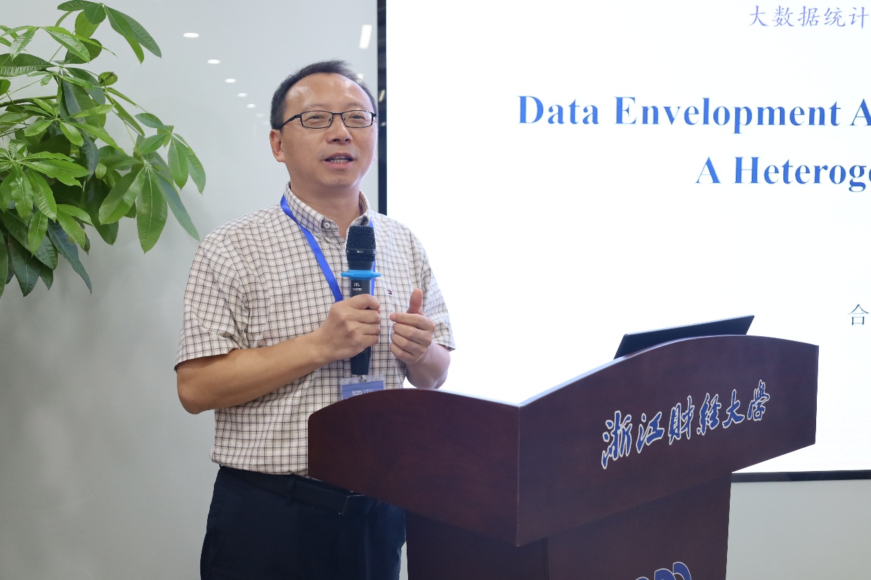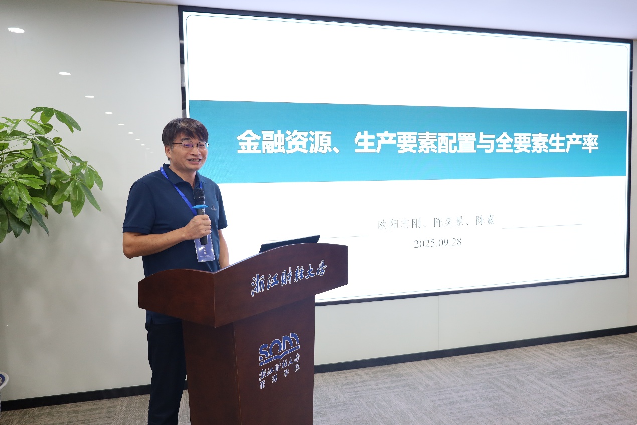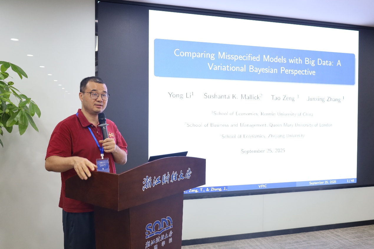 上午下半场由浙江财经大学宣传部部长王正新教授主持,华东交通大学副校长欧阳志刚教授、中国人民大学李勇教授作报告。欧阳志刚教授分享了主题为“金融资源、生产要素配置与全要素生产率”的学术报告。生产要素创新性配置是发展新质生产力、推动经济高质量发展的一个重要渠道,研究构建了一个包括融资部门金融资源配置和生产部门生产要素配置的理论分析框架,并基于中国企业中间投入占比较高的现状,在考虑实物资本和劳动两种生产要素的基础上进一步引入了中间投入,系统地测算并分析了不同类型的金融资源配置对各种生产要素配置及全要素生产率的影响。李勇教授分享了“基于大数据的贝叶斯统计推断研究进展及其应用”。研究针对海量数据下模型设定偏差的模型比较问题,提出两种新的基于惩罚的预测信息准则:先借助变分贝叶斯后验分布,从预测视角推导出变分插入预测分布和变分后验预测分布两类预测分布,接着研究了与这两类分布相关、以数据生成过程和预测分布间KL散度期望定义的风险函数,在特定正则条件下证明所提信息准则是各自风险函数的渐近无偏估计量,最后验证了其在海量数据模型设定偏差场景下模型比较的性能。