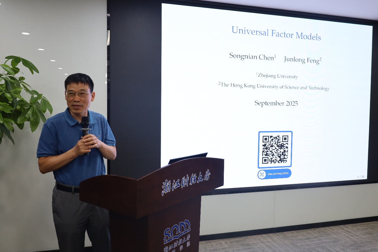下午上半场由中国社会科学院梁华教授主持,华东师范大学统计学院院长周勇教授、浙江大学青山讲席教授陈松年两位嘉宾作报告。周勇教授围绕“金融科技中的数据融合方法与技术及其应用”主题展开分享。他指出,金融科技领域的数据融合技术具有高敏感性、强异构性、高实时性与高准确性四大核心特征;随后,他结合实际应用场景深入讲解,既涵盖了智能风控与反欺诈、精准信用评估(赋能普惠金融)等落地方向,也系统介绍了多源数据在金融科技中的应用技术,以及兼顾隐私保护的金融科技应用技术等关键话题。陈松年教授分享了“Universal Factor Models”。该研究提出一种新的因子模型及两种估计量,可适配经典意义下的“弱因子”:无需知晓因子的弱性程度,且因子只需在因变量(Y)分布的小部分区域具备“强性”,模型还能容纳所有因子均为弱因子的均值因子模型。