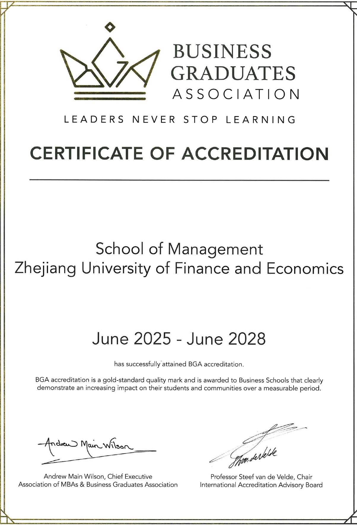 自2019年5月获得AMBA&BGA会员资格以来,管理学院启动实施了详实的认证规划,于2022年获得BGA金牌认证直通资格,先后组织召开多场会议不断完善认证报告,于2025年6月通过现场认证访视。此次在印尼正式获颁金牌认证证书,标志着学院BGA国际认证阶段性工作顺利完成,学院将继续坚持“持续改进”的理念,加强国际交流与合作,不断提升办学水平。