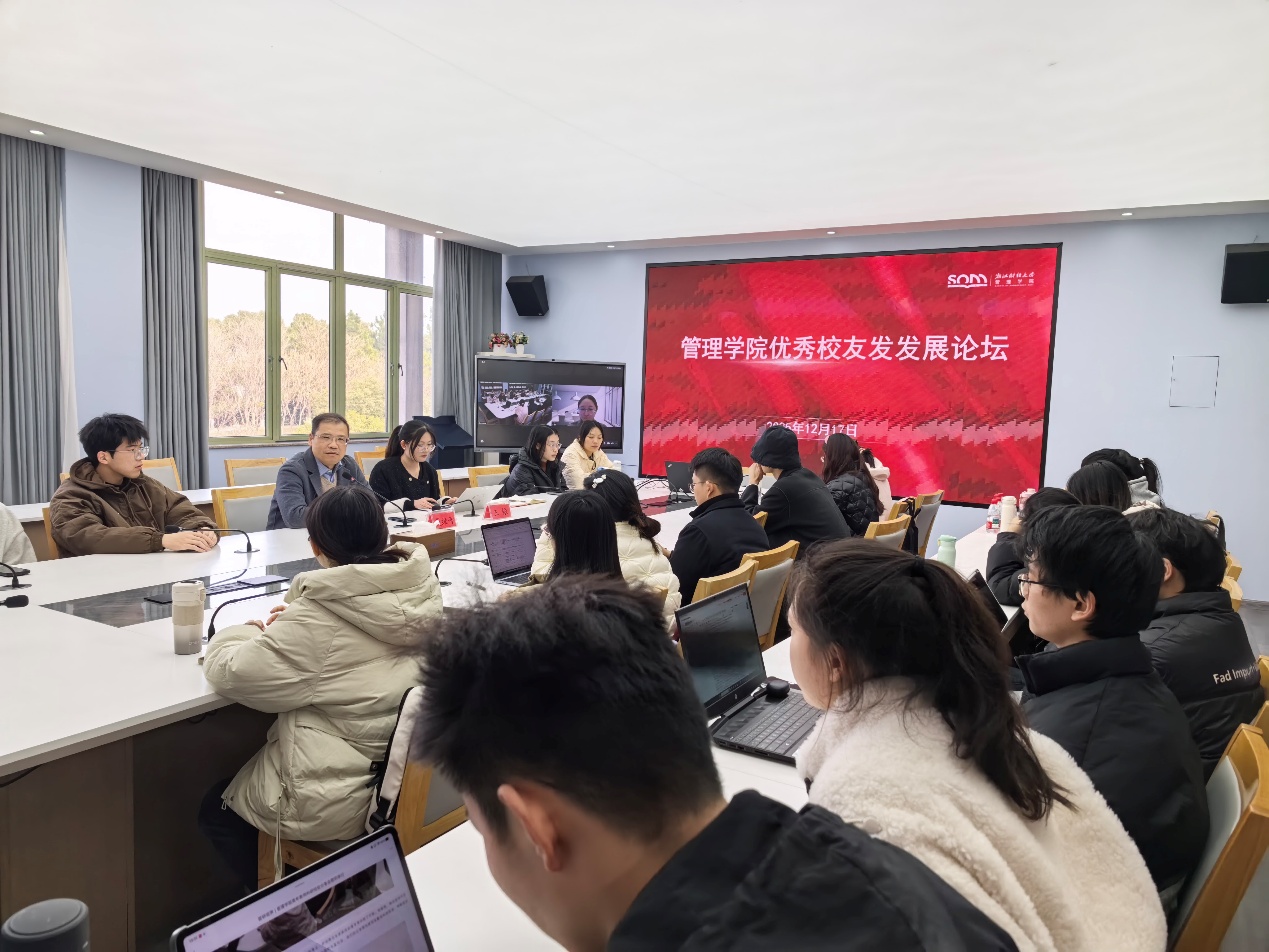 12月18日,浙江财经大学管理学院优秀研究生校友发展论坛顺利举行。作为管理学院2025年研究生学术月的重要活动,本次论坛精心搭建校友与在校生的互动桥梁,助力在读研究生科学规划未来发展路径。