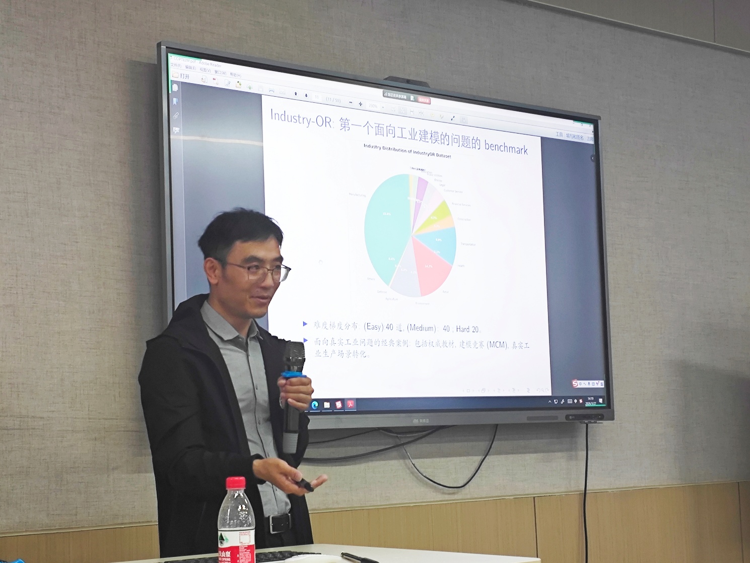 为搭建AI与运筹优化领域的交流平台,助力学生把握技术前沿,3月27日下午,“运筹优化大模型专题讲座”在学院楼5-411教室顺利举办。本次讲座由数智运营研究所、信管系张树柱老师主持,特邀杉数科技算法科学家陈艺天主讲,围绕“COPT求解器助力构建领先运筹优化大模型”主题,分享前沿技术与实战经验,吸引了众多老师和学生参与。主讲人长期深耕人工智能与大模型在优化建模、企业预测等复杂决策领域的研究与应用,凭借深厚的技术积累,曾在KDDCup、CVPRCup和PCICCup等多项高水平国际AI与数据挖掘竞赛中斩获冠亚军,在算法建模与大规模数据分析方面拥有丰富实战经验。