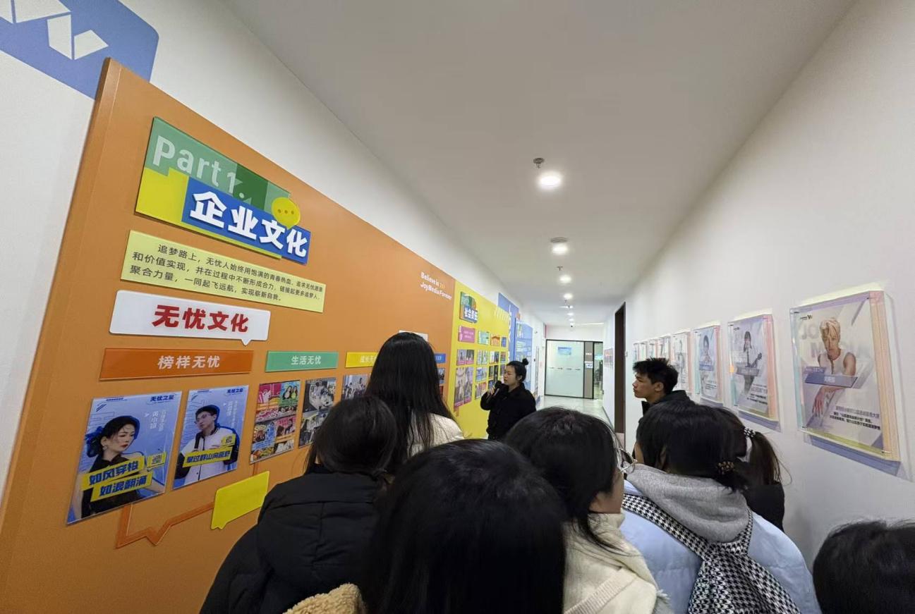 随后,师生们移步至无忧传媒核心文化空间——“无忧之家”,深入学习企业独特的精神内核与文化体系。“无忧之家”以温暖、活力的设计风格,通过照片墙、文化标语、互动展区等形式,传递出企业“开放、协作、拼搏、共赢”的价值观。讲解员介绍,“无忧之家”不仅是员工交流、放松的空间,更是企业精神传承的载体。墙上张贴的“达人成长故事”“团队攻坚案例”,记录着无忧人从“新人”到“行业精英”的蜕变,也展现了团队在面对业务挑战时的协作与坚韧;“奋斗者荣誉墙”上,每一位获得表彰的员工事迹,都诠释着企业“以奋斗者为本”的理念——尊重每一份努力,激励每一次创新。师生们在“无忧课堂”展区停留许久,这里定期开展达人培训、业务分享、技能提升等活动,体现了企业对员工成长的重视。