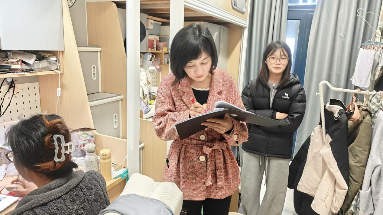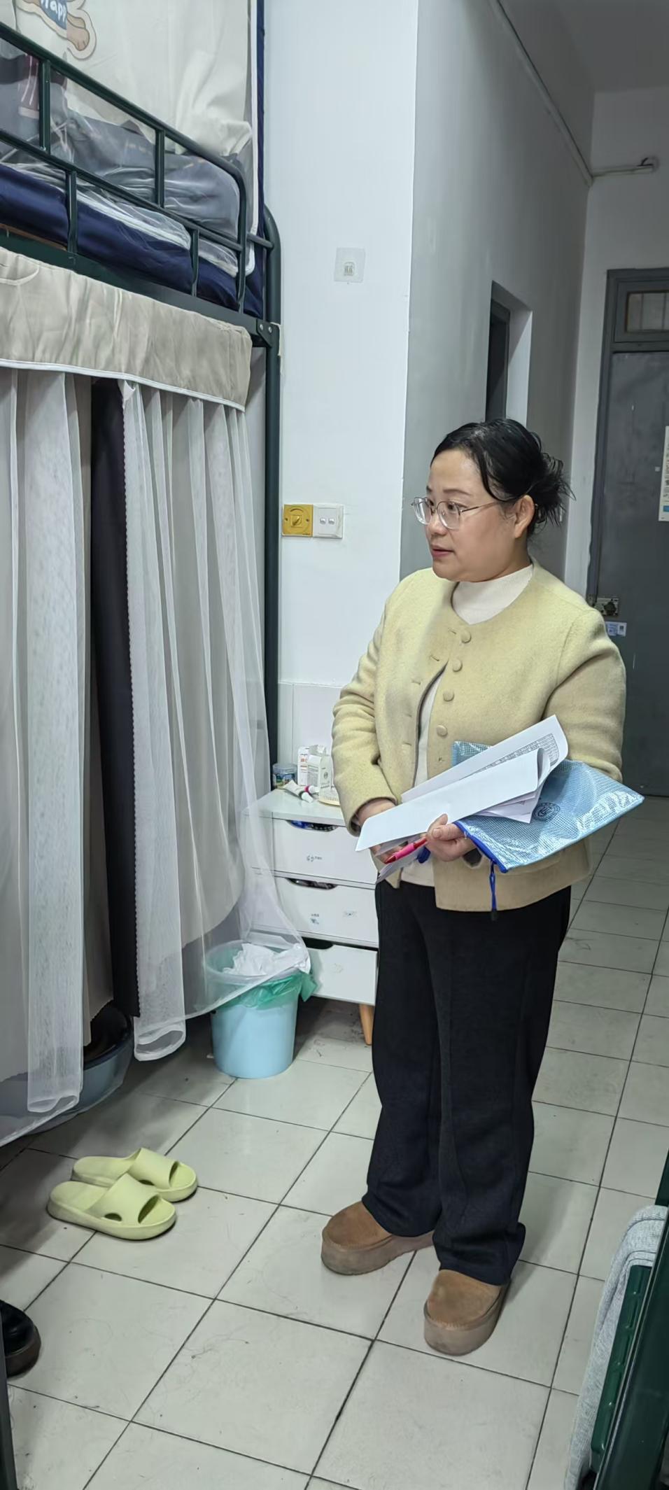 与此同时,联动学生“一站式”社区网格员队伍,全面开展入寝安全专项检查工作。网格员们深入每一间学生宿舍,重点排查宿舍内违规电器使用、私拉乱接电线、消防设施遮挡等安全隐患,仔细检查宿舍卫生状况与用电安全,同步做好隐患登记与现场提醒,引导学生养成安全规范的生活习惯,共同维护安全舒适的住宿环境。