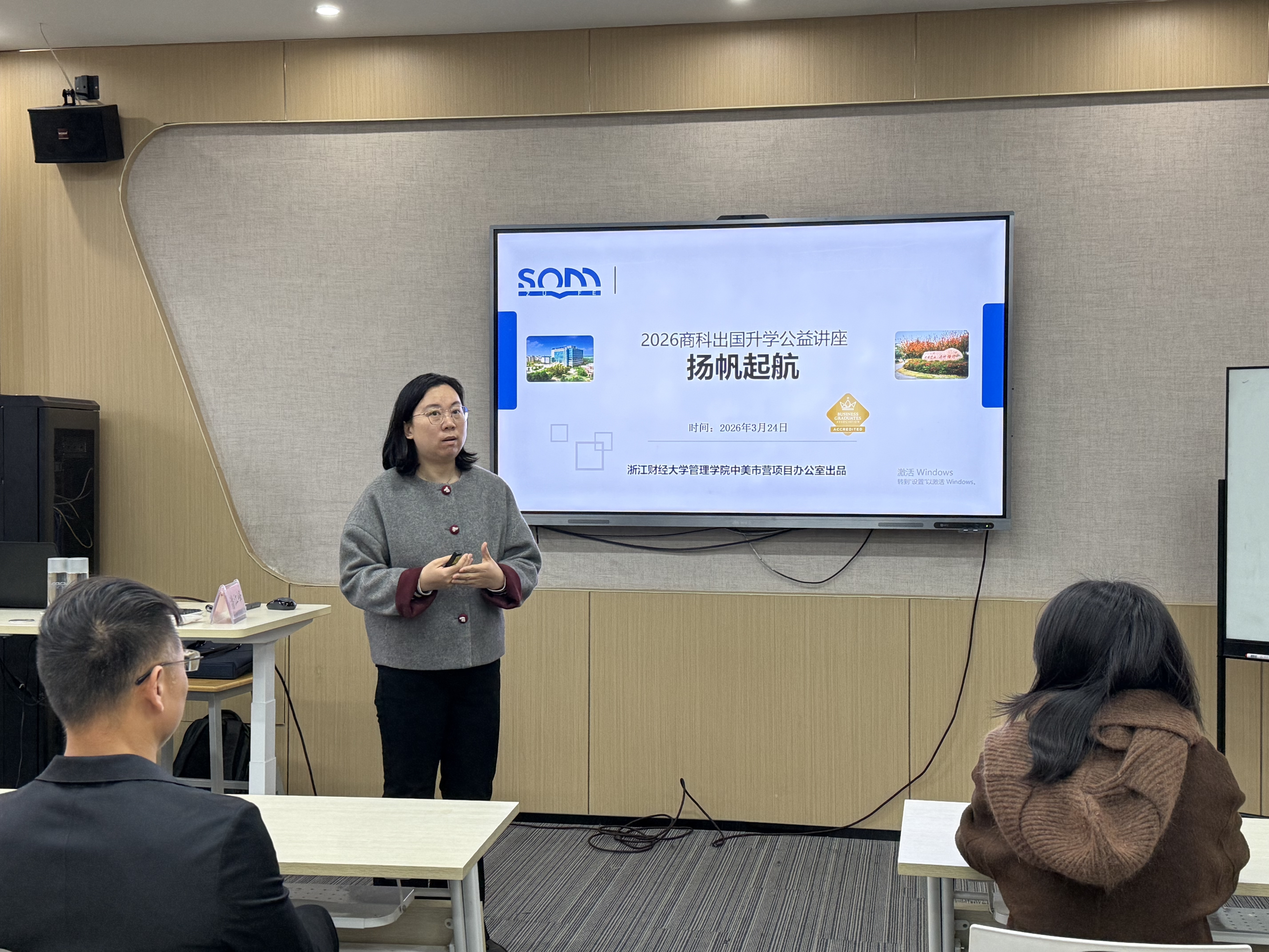 2026年3月24日下午,为进一步提升中美合作办学项目人才培养质量,帮助学生明确发展方向、科学规划未来,浙江财经大学管理学院中美市营项目办公室在学院楼5411举办“扬帆起航——商科出国升学规划分享会”。本次活动由项目主任陈颖主持,特邀国际教育专家潘江峰担任主讲嘉宾,并邀请赴UT学生代表刘碧涵进行分享,吸引了中美市营项目多届学生积极参与。