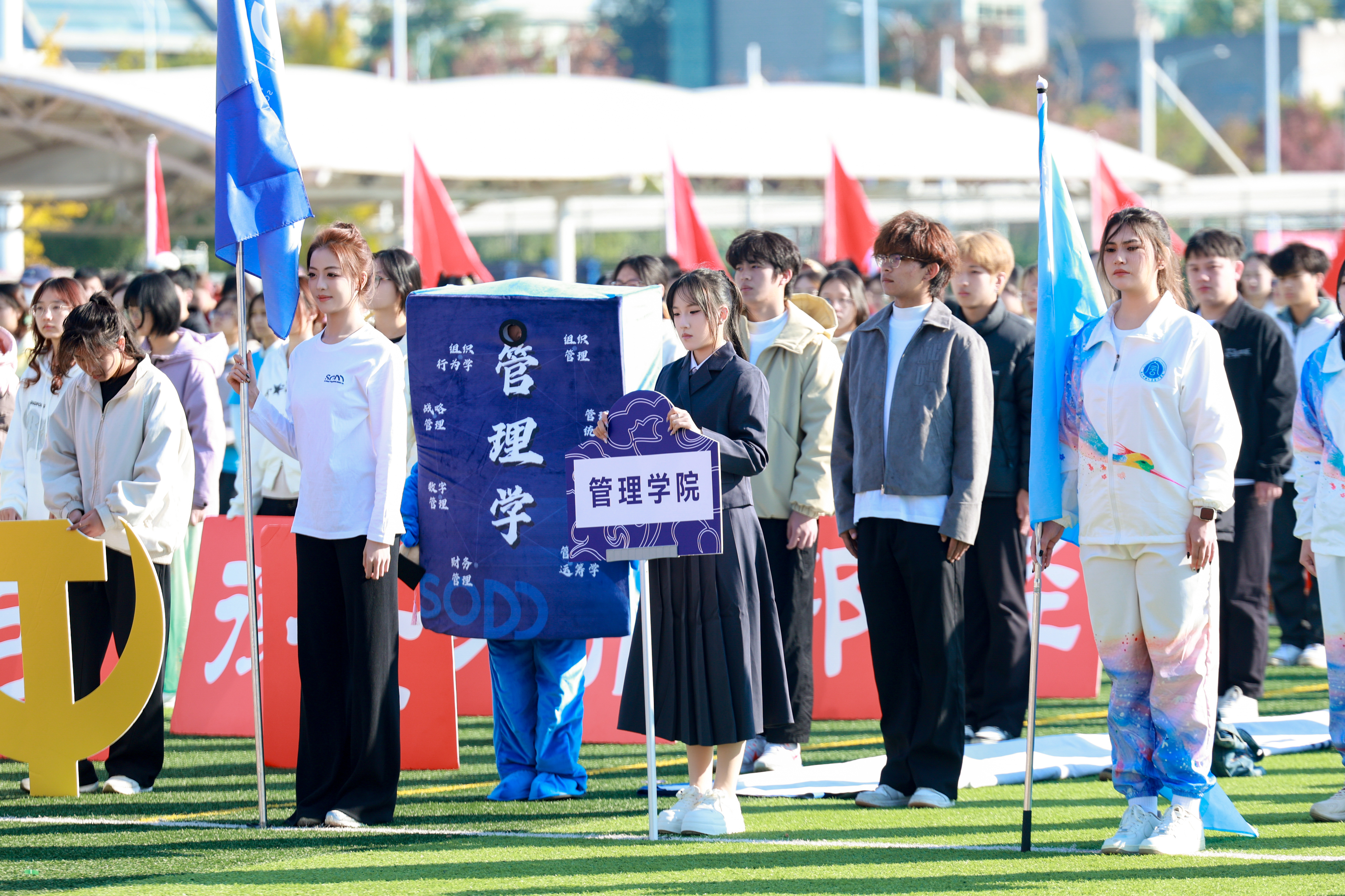 开幕式上,管理学院方阵昂首阔步、精神抖擞,整齐的队列尽显团结风貌,嘹亮的口号铿锵有力,满含管院人的热忱与坚毅,以昂扬姿态展现学院风采,不负韶华、勇毅前行的信念随步伐坚定传递。随着开赛指令响起,管院健儿全力以赴,在赛场之上书写奋斗篇章。