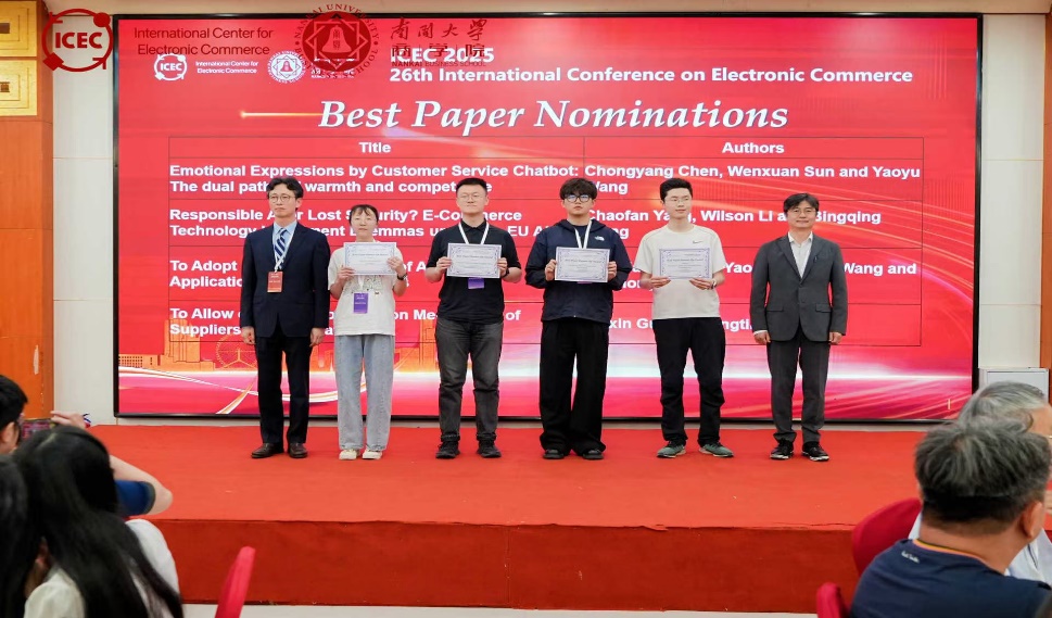 近日,第二十六届国际电子商务会议(International Conference on Electronic Commerce, ICEC 2025)在天津南开大学商学院举行。本次会议由国际电子商务中心、中国天津南开大学和韩国智能信息系统学会联合承办。本次会议的主题为“人工智能赋能电子商务:在创新、个性化与伦理挑战中前行”。我院2024级研究生孙文轩与导师陈重阳副教授合作的论文《Emotional Expressions by Customer Service Chatbot: The dual paths of warmth and competence》受邀汇报。