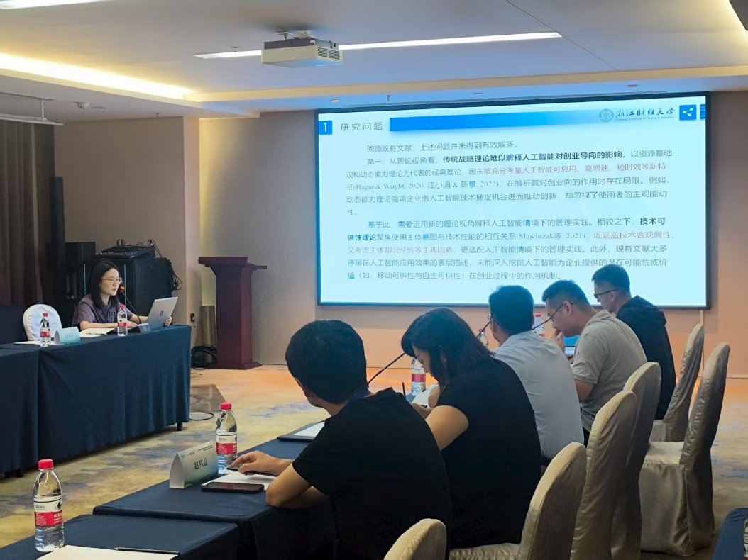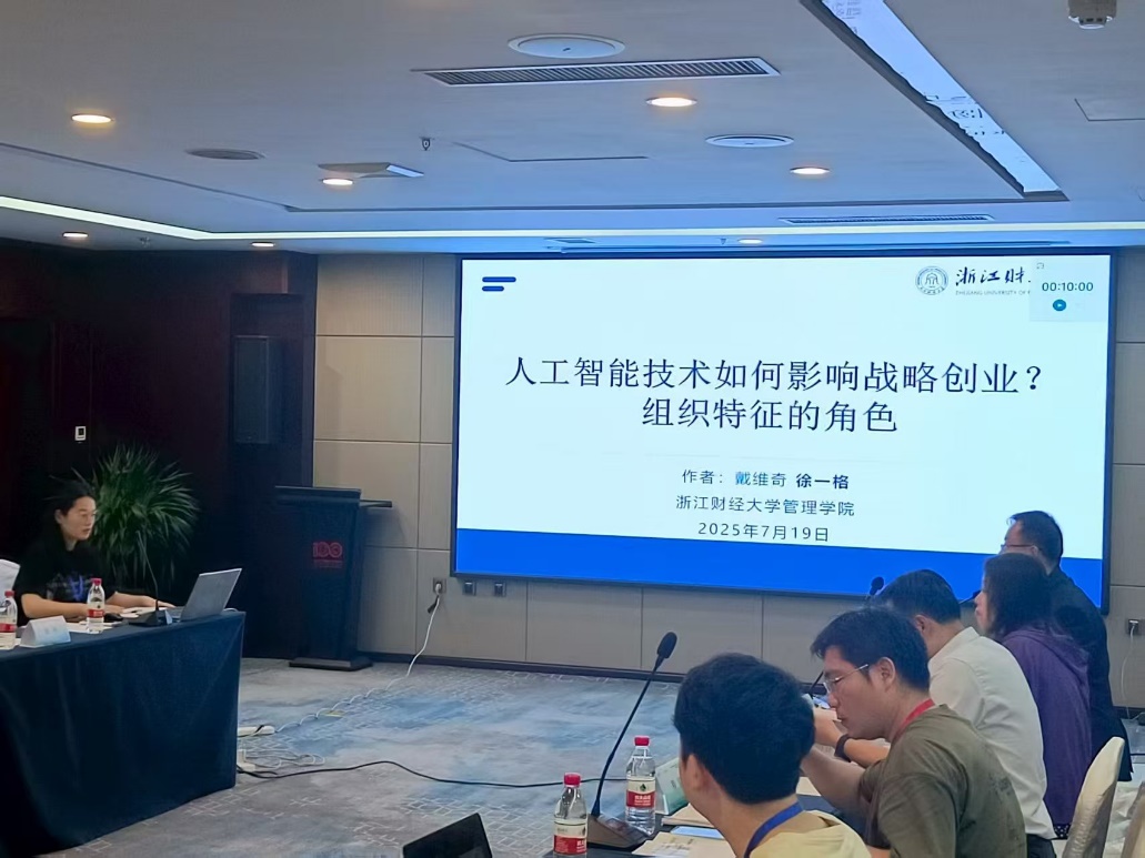 2023级硕士研究生徐一格与导师戴维奇教授合作的论文《人工智能技术如何影响战略创业?组织特征的角色》受邀汇报。该论文基于人工智能自动化-增强悖论,探究人工智能技术对企业战略创业的双刃剑效应及其作用机制。该研究首次揭示人工智能技术驱动战略创业的双重路径及其边界条件,不仅拓展了技术视角的战略创业前因研究,更为企业应对技术的双重影响、动态调整人工智能赋能策略提供了理论依据与实践启示。