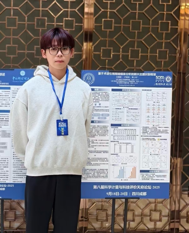 2025年9月19日-20日,由中国科学院成都文献情报中心主办、科技创新评价研究中心(SERC)承办、15家单位协办、18家期刊支持的“第八届科学计量与科技评价天府论坛”在成都举行。论坛主题为“AI时代科学计量范式重构与科技评价革新”,吸引了来自挪威、澳大利亚及国内众多高校科研院所的130余位学者和师生参与。我院数智决策研究中心教师王婉茹及其指导的硕士生卢明涛投稿学术海报并参加本次会议。