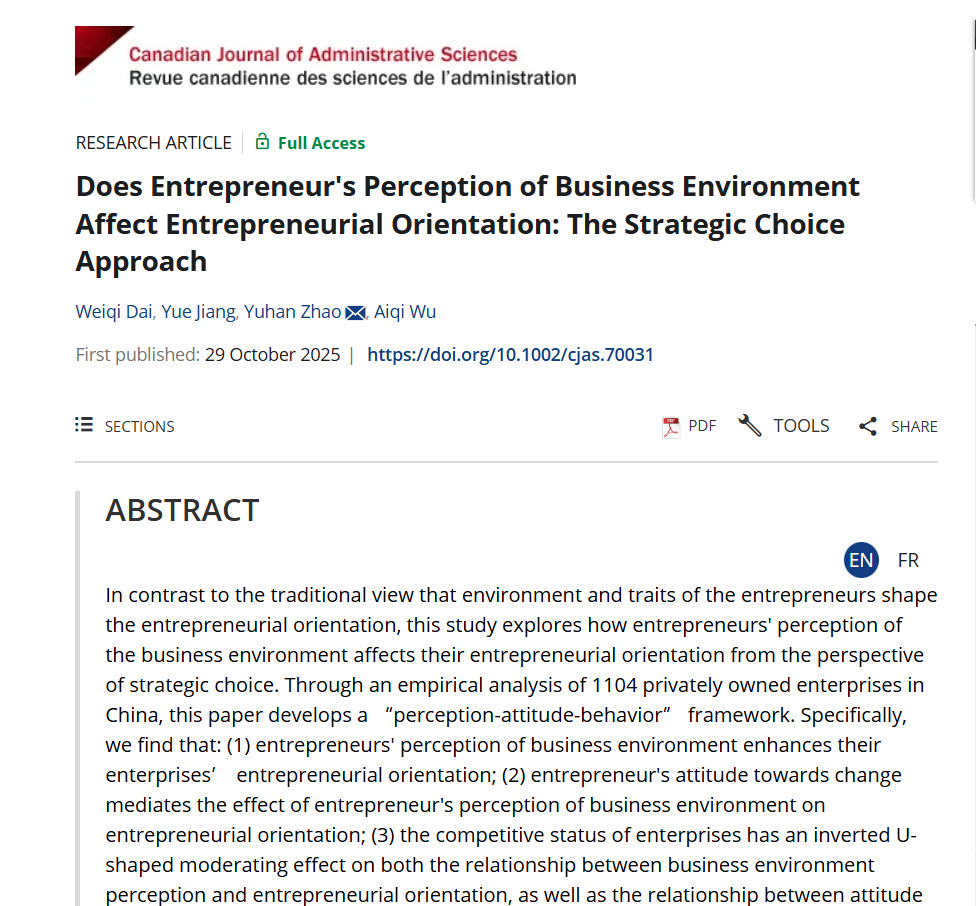 我院研究生姜悦在导师戴维奇教授的指导下,与我院赵雨菡博士、浙江大学邬爱其教授合作,共同完成了《Does Entrepreneur's Perception of Business Environment Affect Entrepreneurial Orientation: The Strategic Choice Approach》论文,该研究成果被《Canadian Journal of Administrative Sciences》(ABS2)期刊录用。
