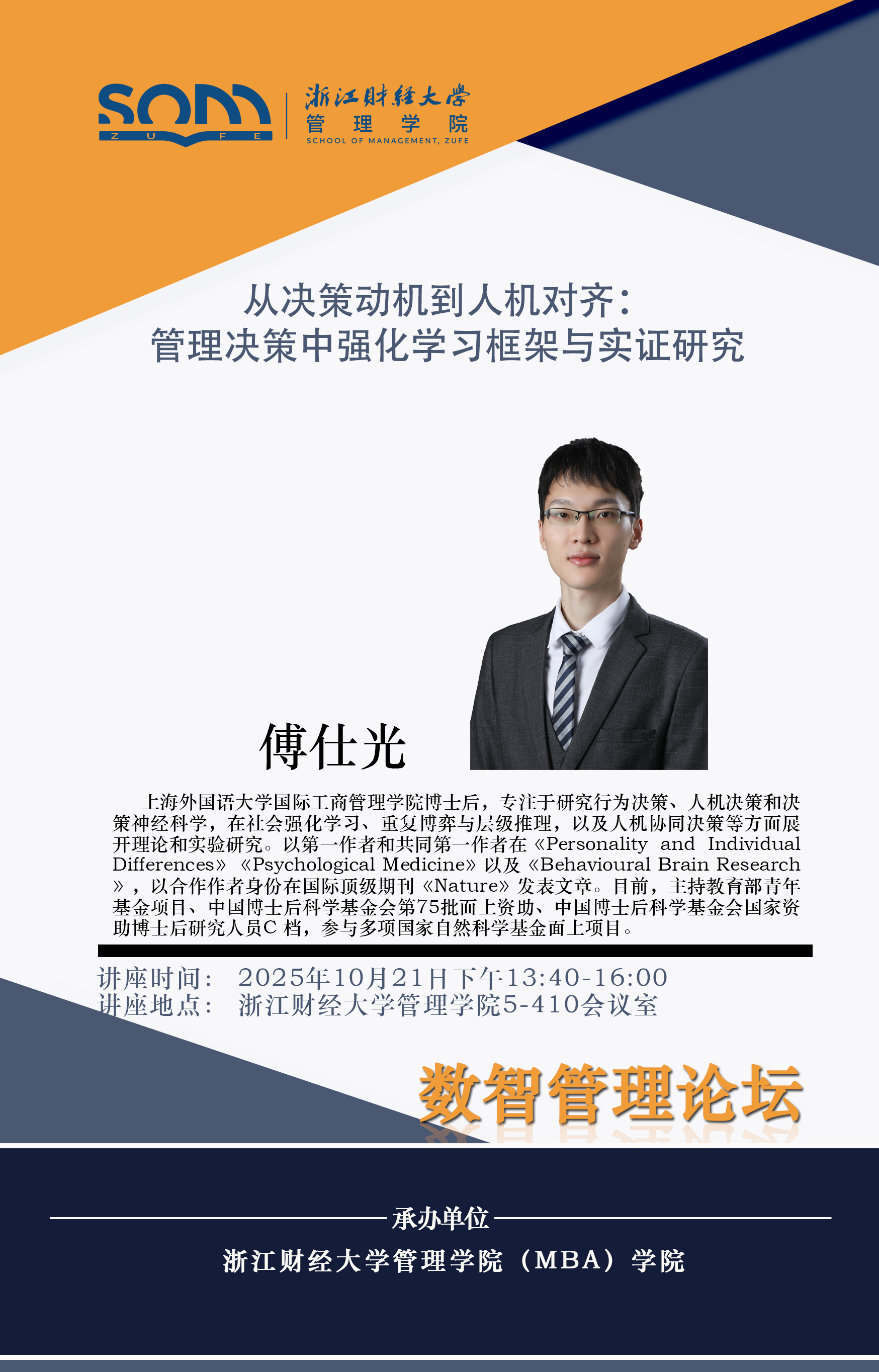 管理学院新财经战略系列学术活动2025年第53期【学术报告】傅仕光:从决策动机到人机对齐:管理决策中强化学习框架与实证研究