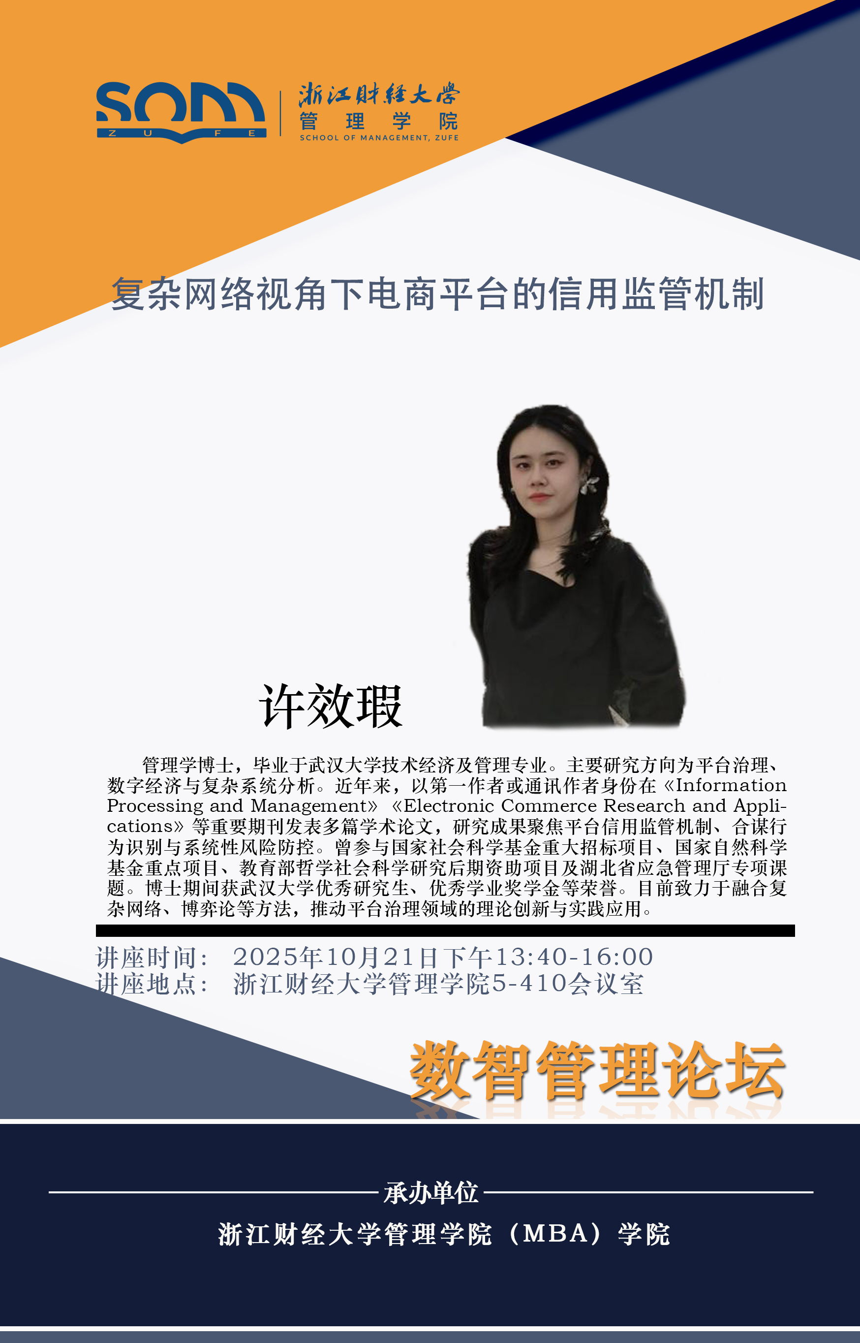 管理学院新财经战略系列学术活动2025年第54期【学术报告】许效瑕:复杂网络视角下电商平台的信用监管机制