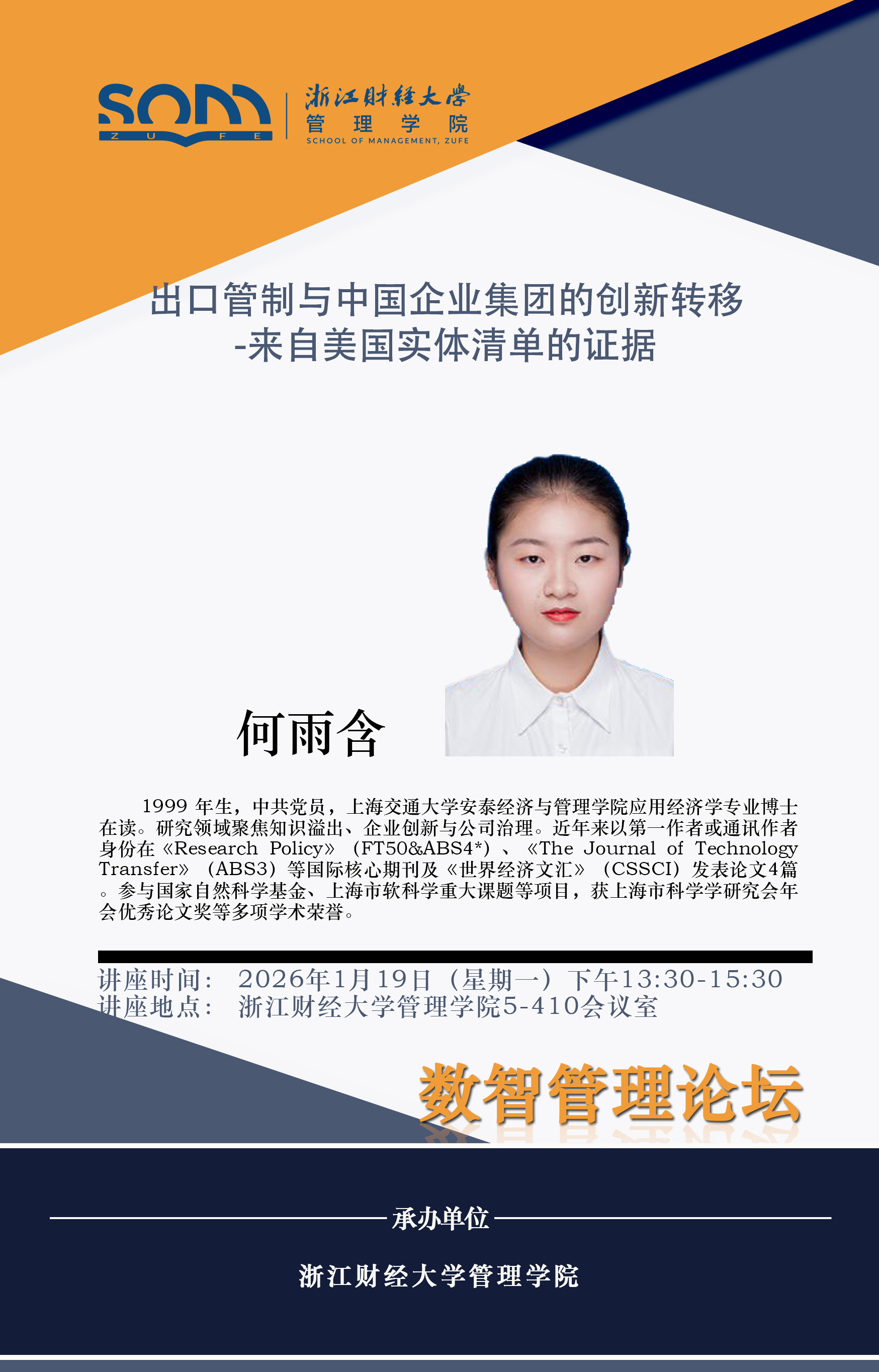 管理学院新财经战略系列学术活动2026年第2期【学术报告】何雨含:出口管制与中国企业集团的创新转移-来自美国实体清单的证据