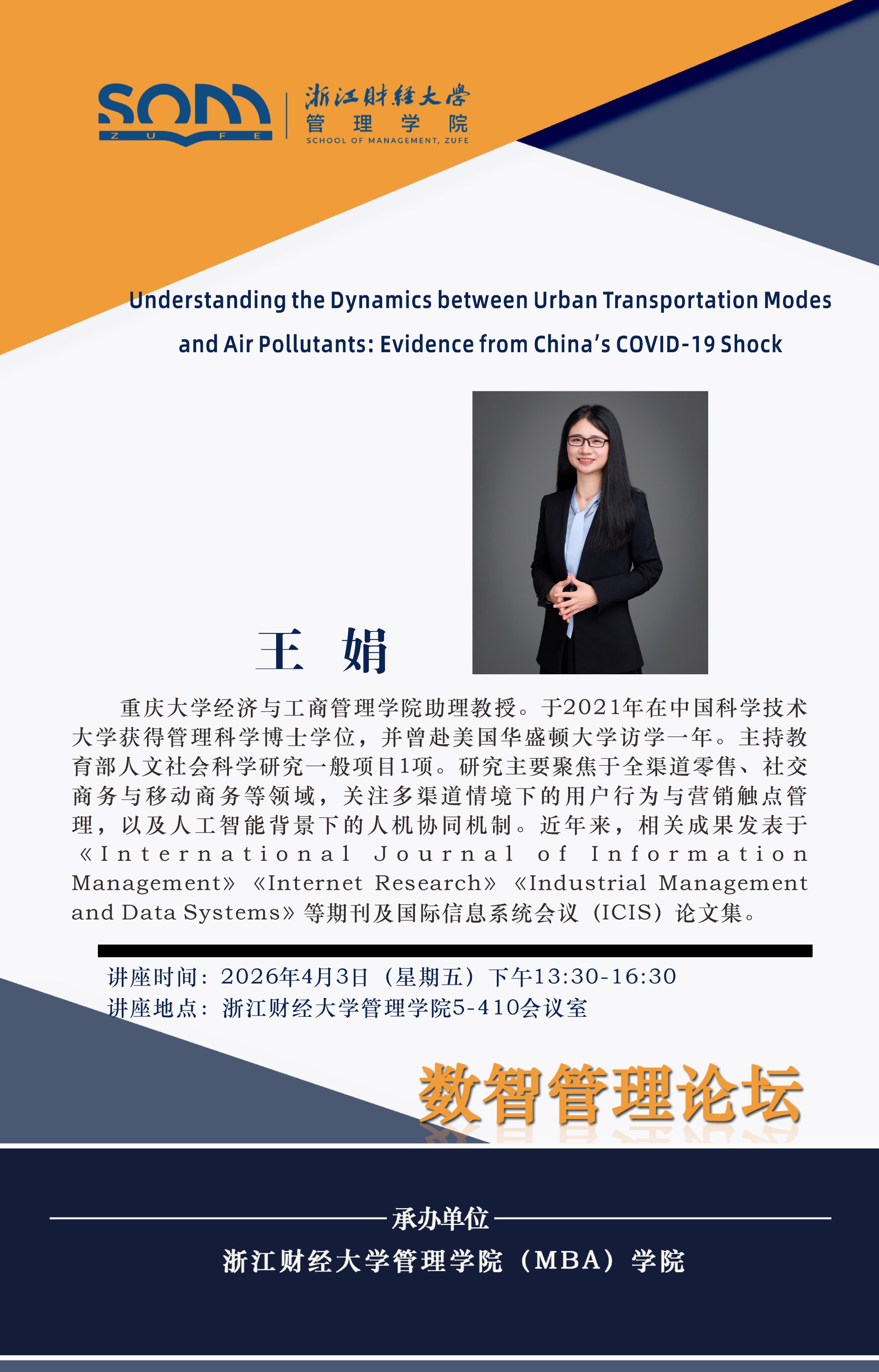 管理学院新财经战略系列学术活动2026年第11期【学术报告】王娟:Understanding the Dynamics between Urban Transportation Modes and Air Pollutants Evidence from China’s COVID-19 Shock