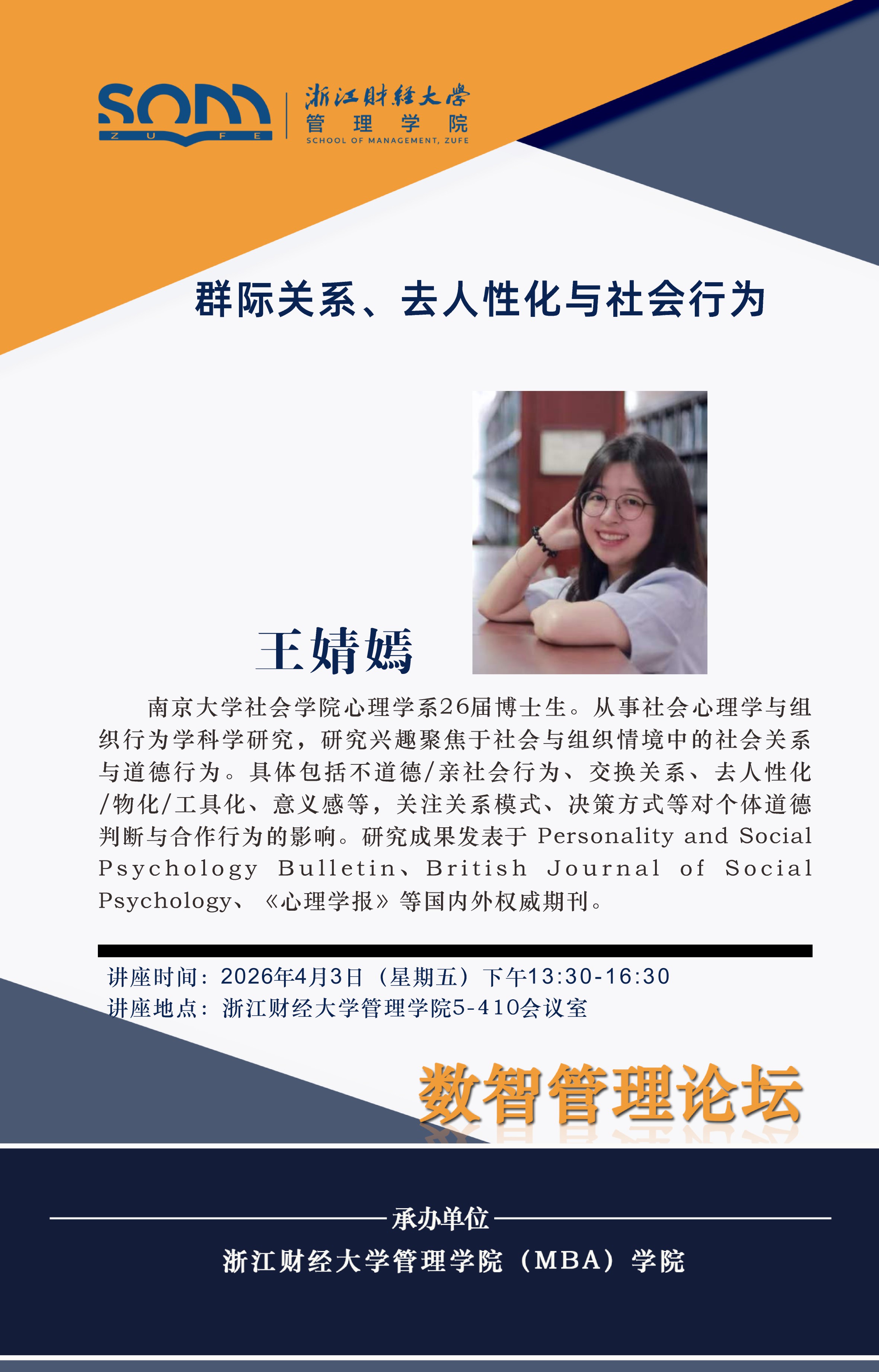 管理学院新财经战略系列学术活动2026年第12期【学术报告】王婧嫣:群际关系、去人性化与社会行为