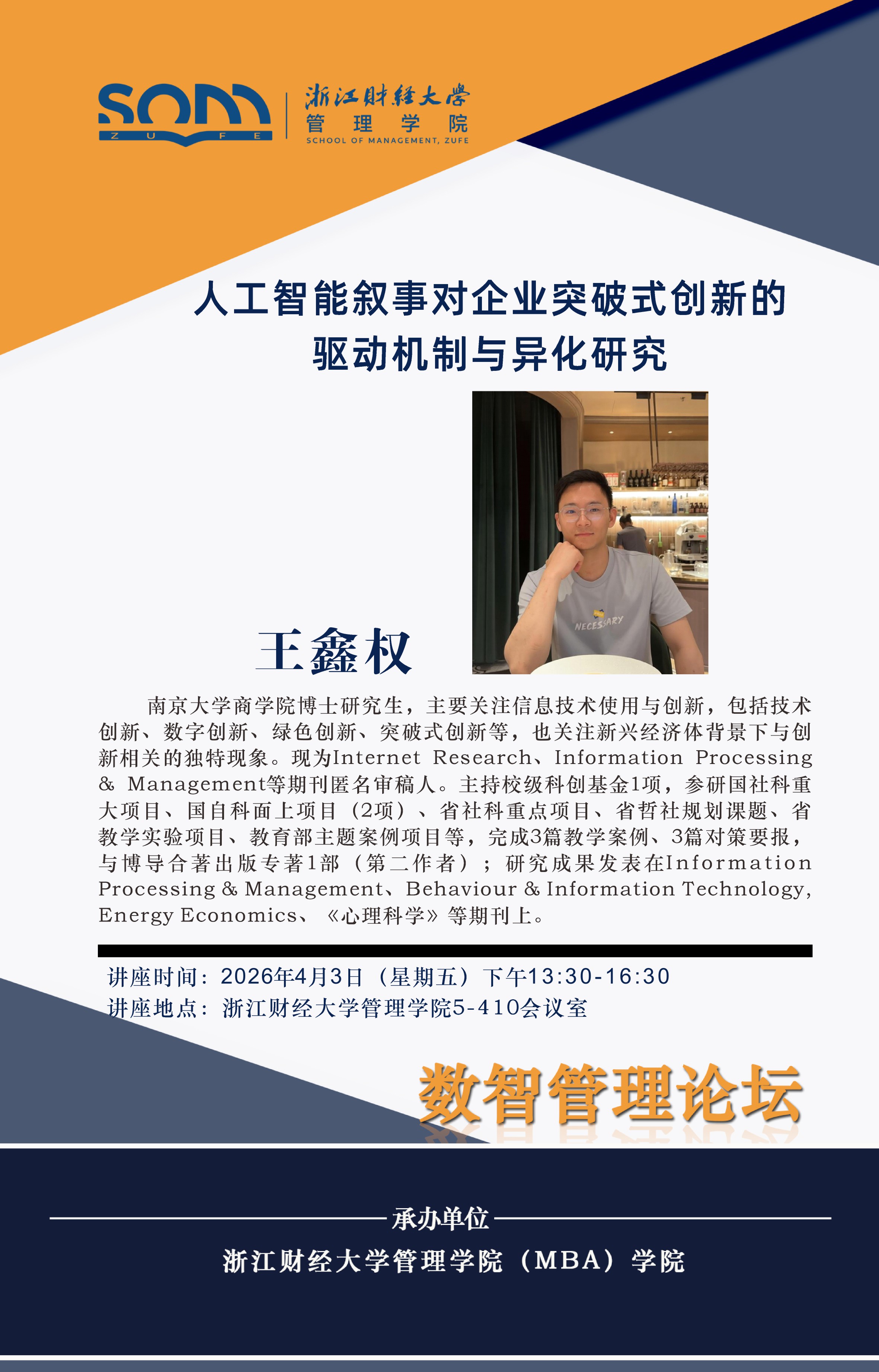 管理学院新财经战略系列学术活动2026年第14期【学术报告】王鑫权:人工智能叙事对企业突破式创新的驱动机制与异化研究