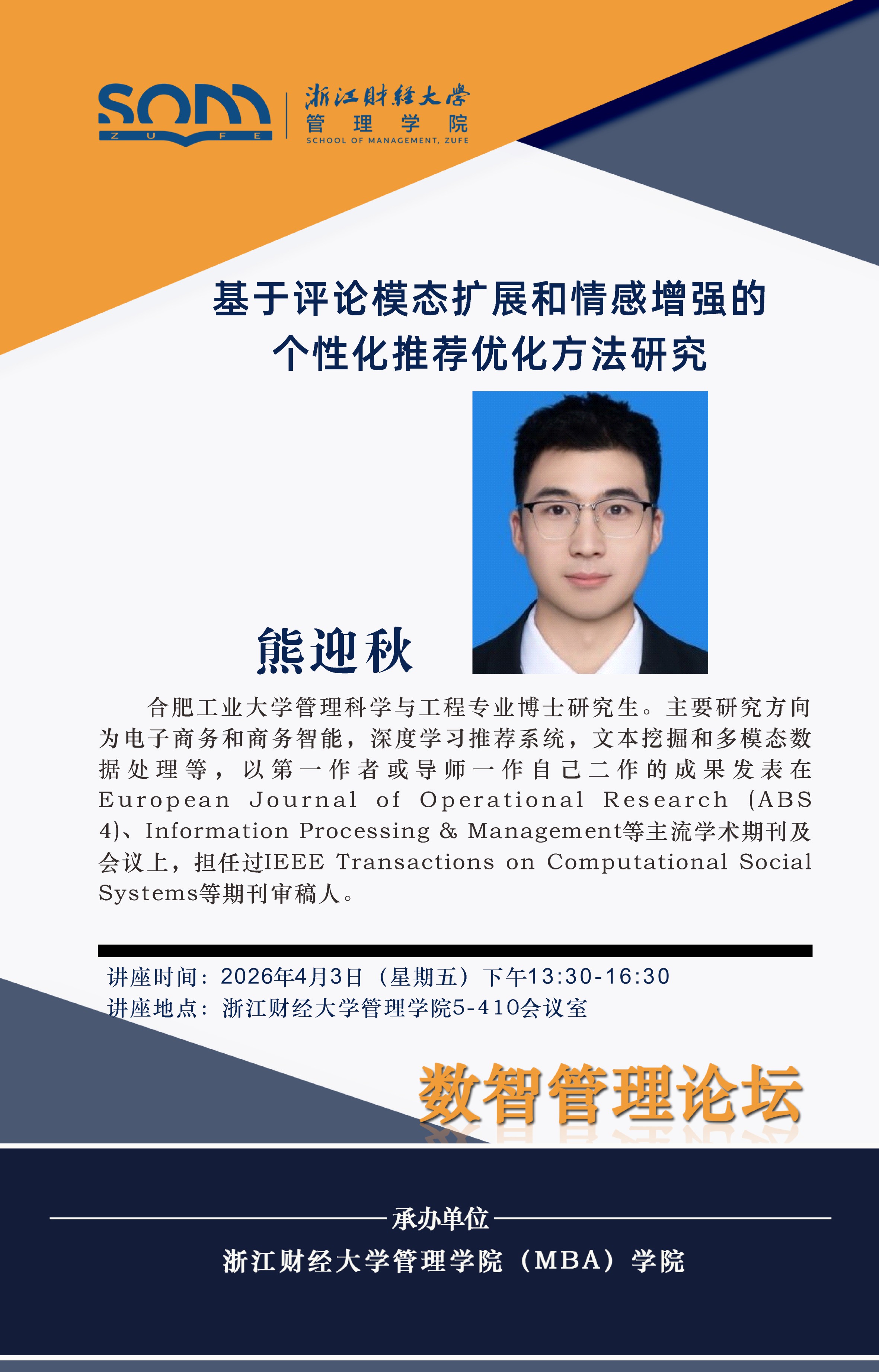 管理学院新财经战略系列学术活动2026年第16期【学术报告】熊迎秋:基于评论模态扩展和情感增强的个性化推荐优化方法研究