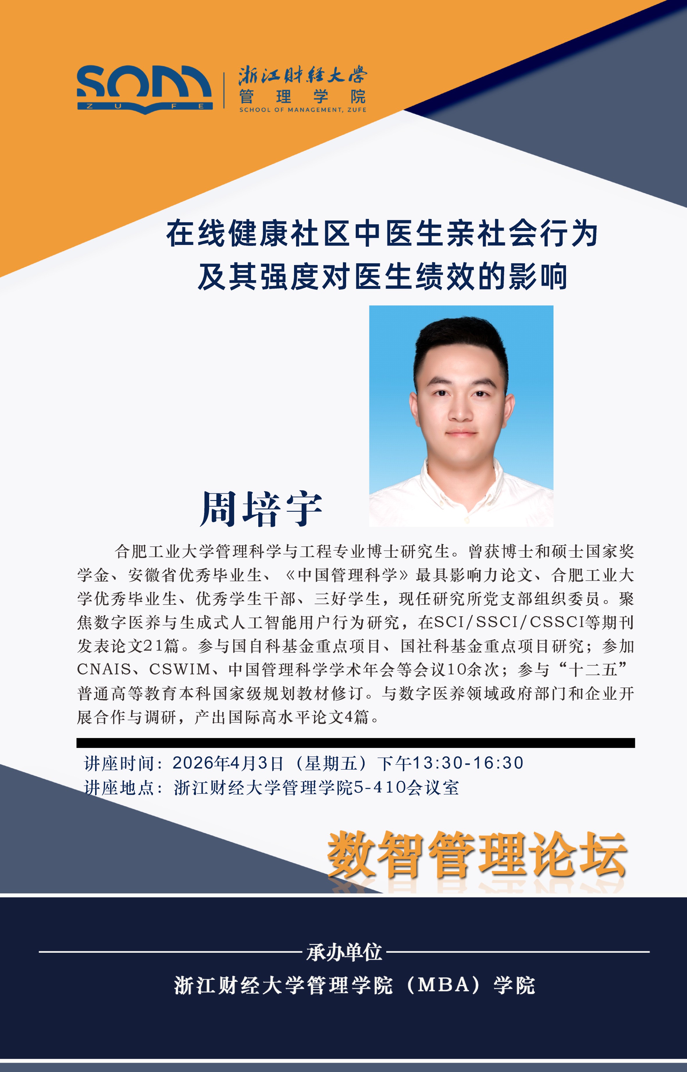 管理学院新财经战略系列学术活动2026年第17期【学术报告】周培宇:在线健康社区中医生亲社会行为及其强度对医生绩效的影响