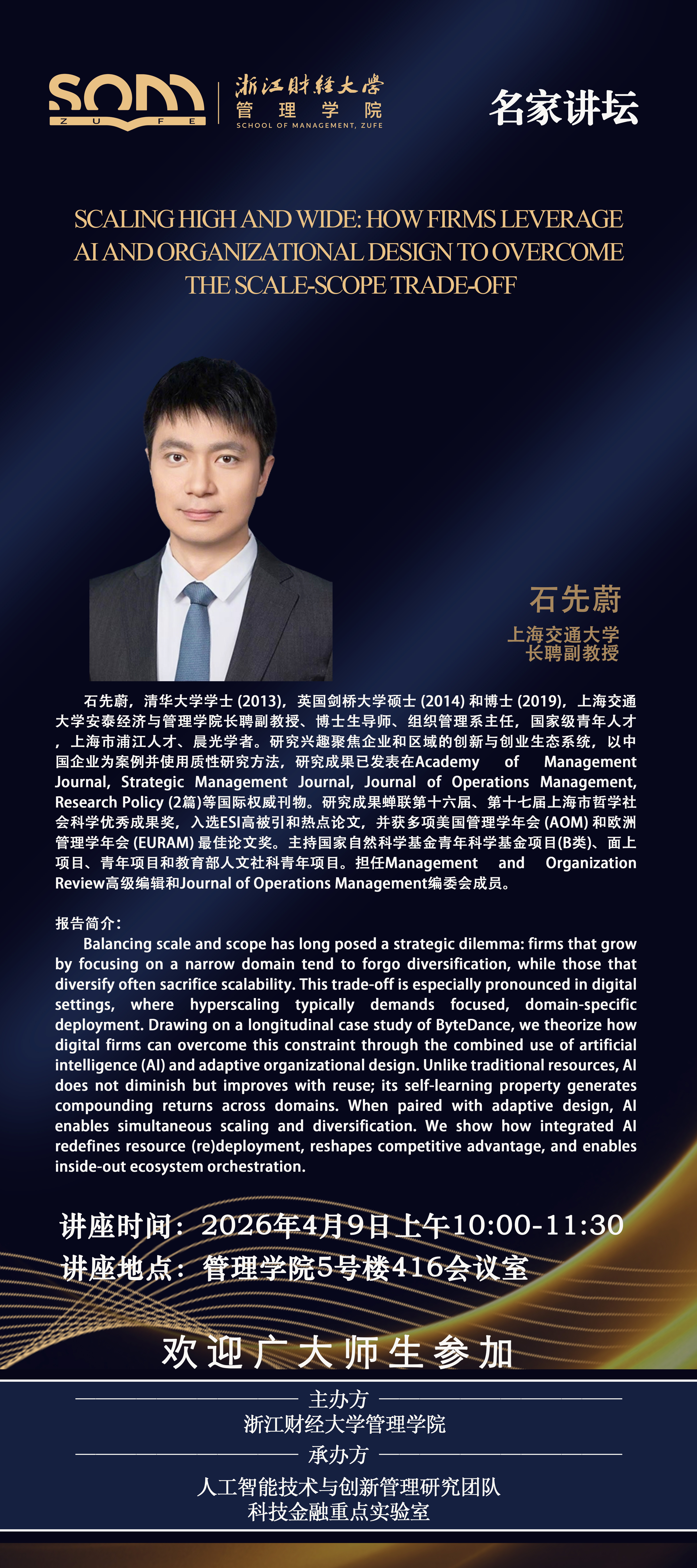 管理学院新财经战略系列学术活动2026年第18期【名家讲坛】石先蔚:Scaling high and wide: how firms leverage ai and organizational design to overcome the scale-scope trade-off
